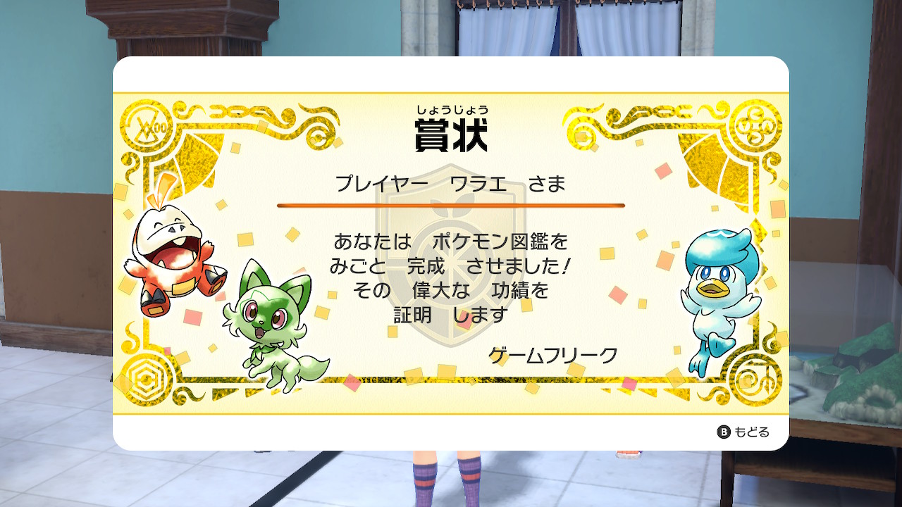 昔と違い、ネットを使って交換ができるようになったので、図鑑を揃えるのがかなり簡単になっており、第9世代にてようやく図鑑を完成させることが出来た。
