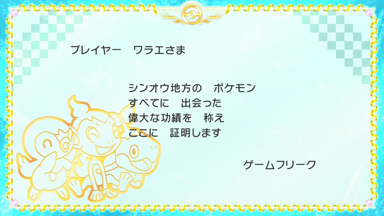 表彰状自体は捕まえなくても、ポケモンを見てさえいればよかったようで、そのあと150匹捕まえても特に何ももらえなかった。
